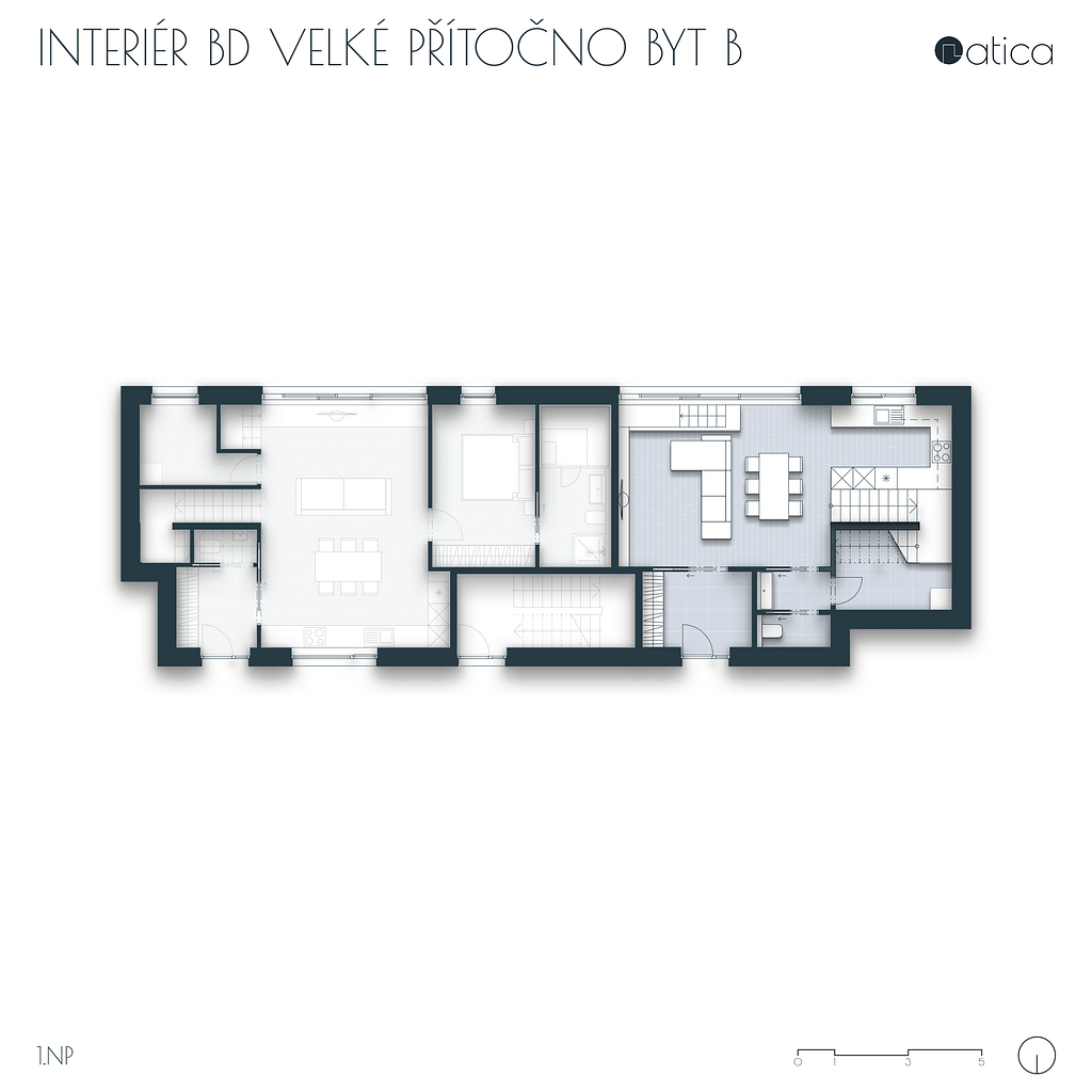 V rámci projektu bytového domu ve Velkém Přítočně jsme měli možnost navrhnout 3 byty. V návrhu jsme pracovali s obývacími prostory s propojením na terasu. Všechny byty jsou pojednány stylově s jednoduchým a účelovým designem.