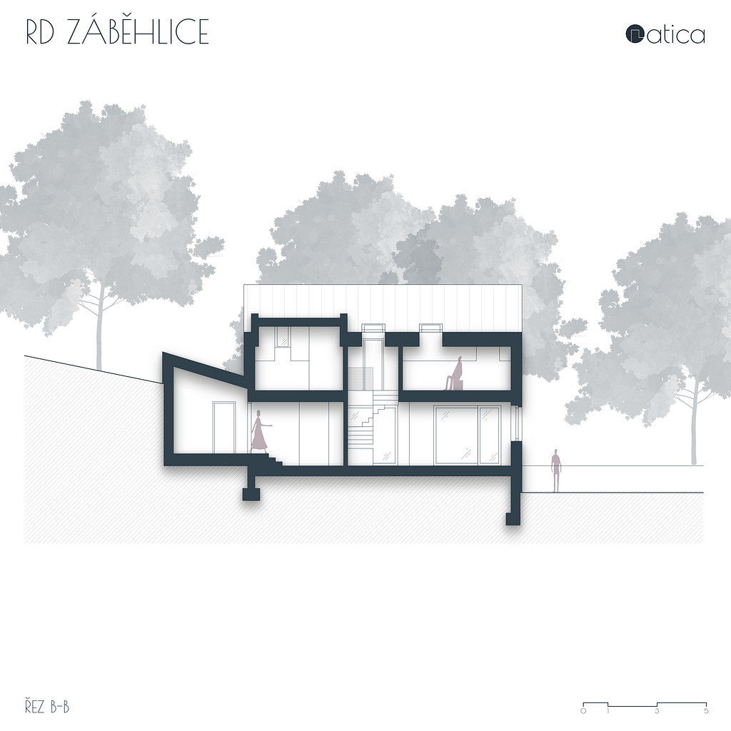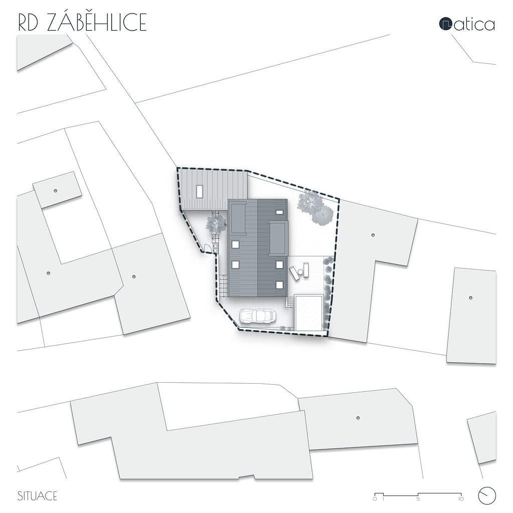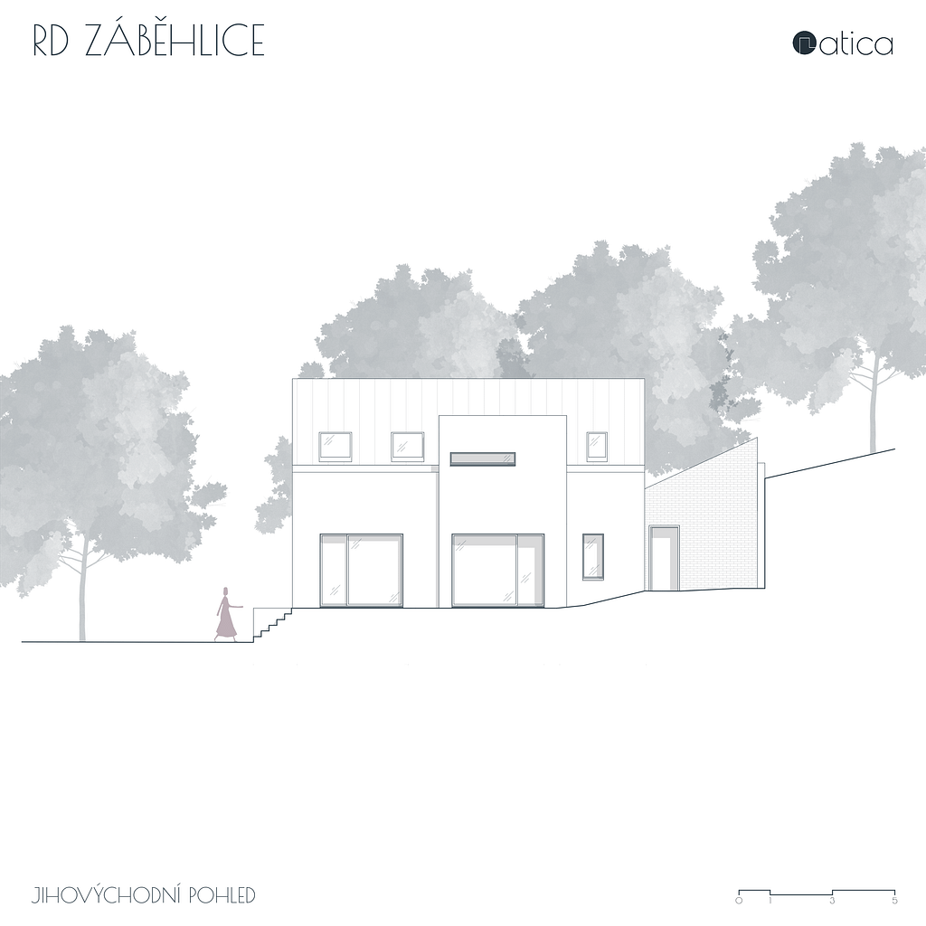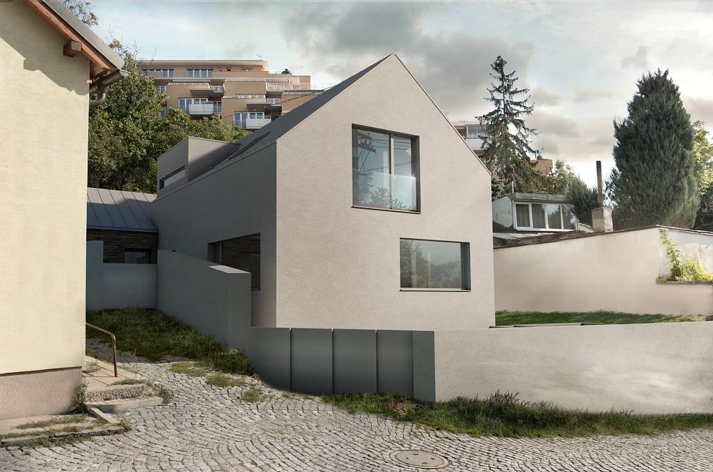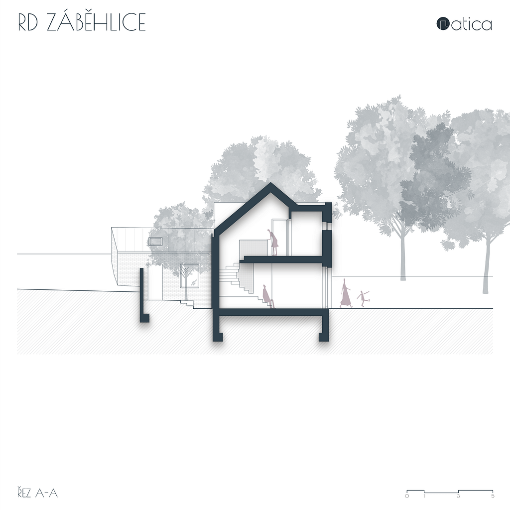 Stísněný pozemek v rostlé zástavbě starých Záběhlic do značné míry definoval navržený rodinný dům. Původní rodinný dům stojící podél ulice byl odstraněn a nový dům byl umístěn otočený hřebenem na přilehlou ulici. Tím společně s opěrnou zdí došlo k vytvoření malé soukromé zahrady v návaznosti na hlavní pobytovou plochu domu. Pozemek i samotný dům je řešen terasovitě, aby využití jednotlivých ploch bylo maximální. V přízemí domu je denní část, v podkroví je část noční.