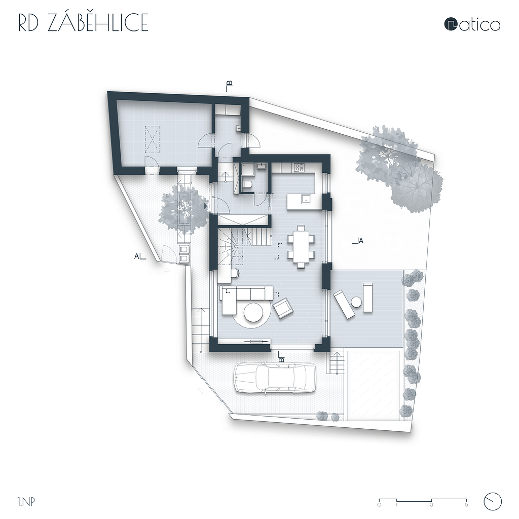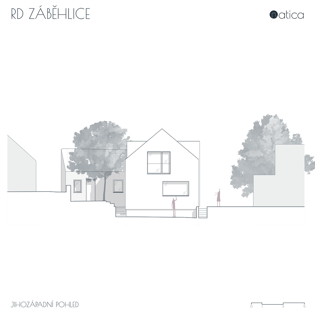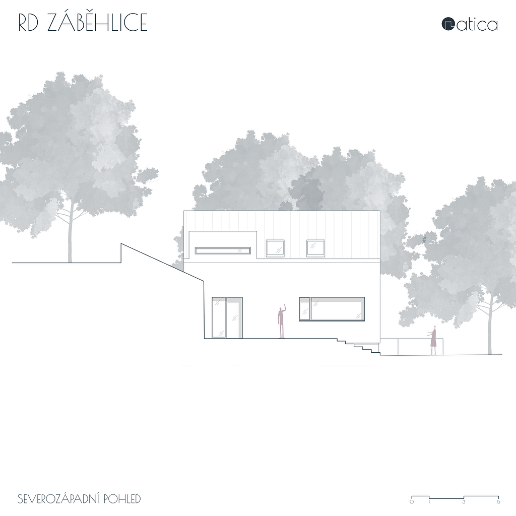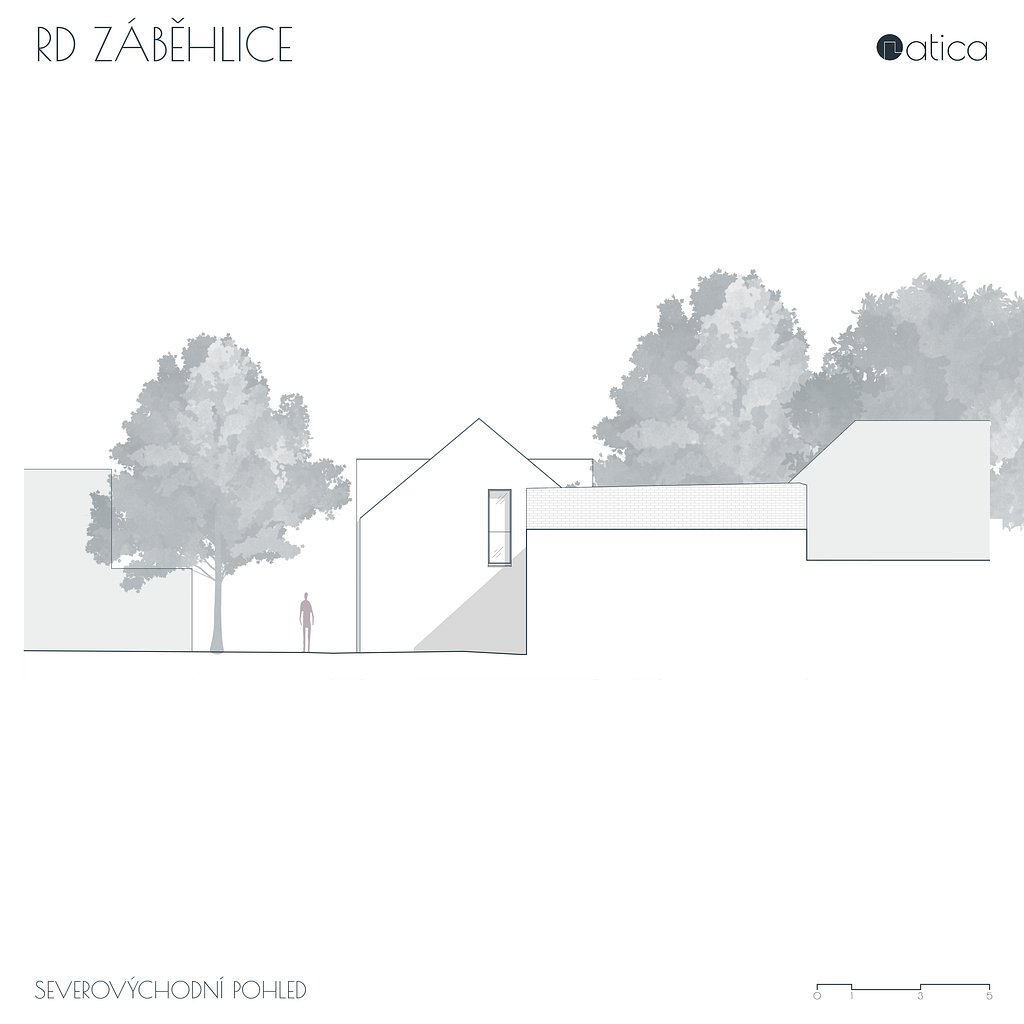 Stísněný pozemek v rostlé zástavbě starých Záběhlic do značné míry definoval navržený rodinný dům. Původní rodinný dům stojící podél ulice byl odstraněn a nový dům byl umístěn otočený hřebenem na přilehlou ulici. Tím společně s opěrnou zdí došlo k vytvoření malé soukromé zahrady v návaznosti na hlavní pobytovou plochu domu. Pozemek i samotný dům je řešen terasovitě, aby využití jednotlivých ploch bylo maximální. V přízemí domu je denní část, v podkroví je část noční.
